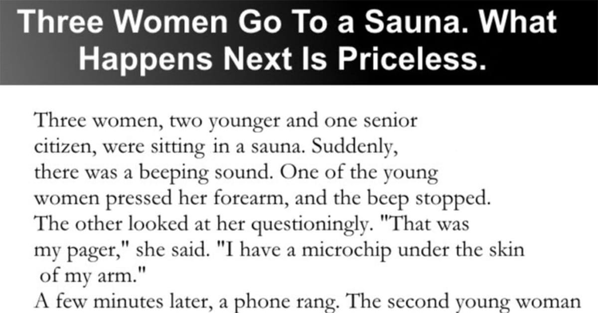 Three women, two younger and one senior citizen were sitting in a sauna. Suddenly there was a beeping sound. The first young woman pressed her forearm and the beep stopped. The others looked at her questioningly. “It was my pager,” she said. “I have a microchip under the skin of my arm.”