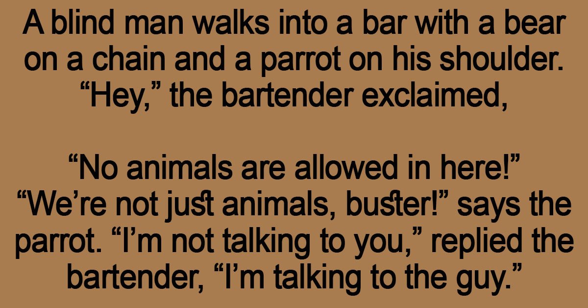 A blind man walks into a bar with a bear on a chain and a parrot on his shoulder.