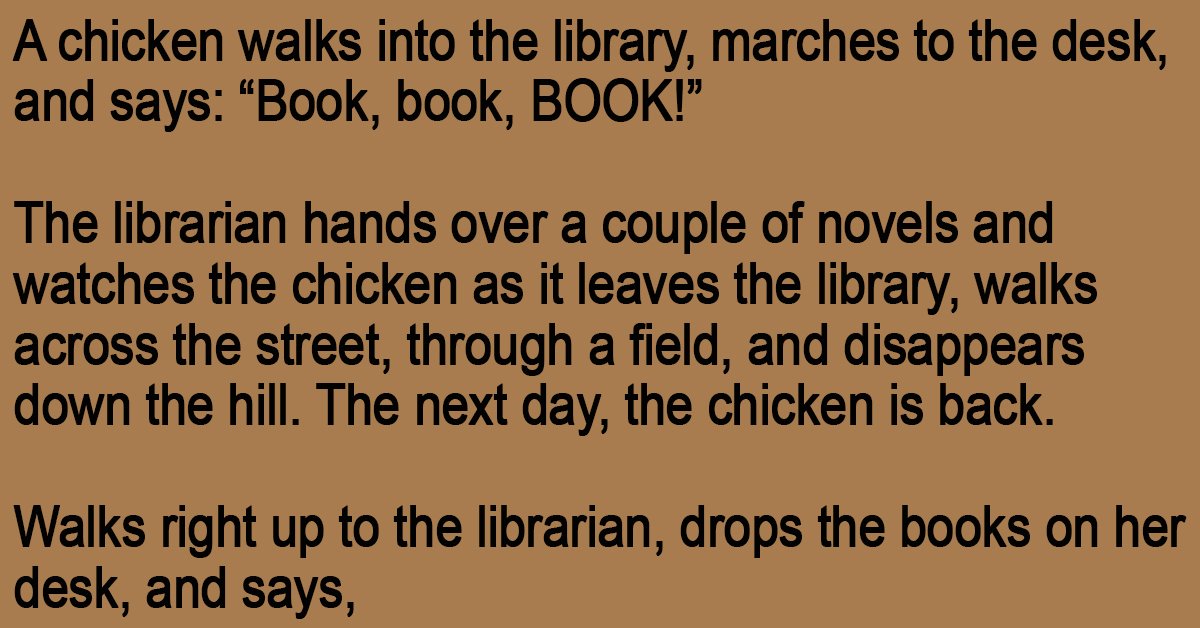 A chicken walks into the library, marches to the desk, and says: “Book, book, BOOK!”