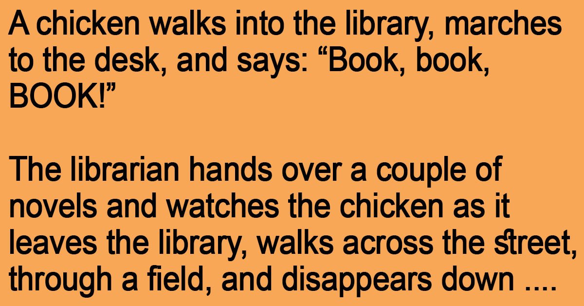 A chicken walks into the library, marches to the desk, and says: “Book, book, BOOK!”
