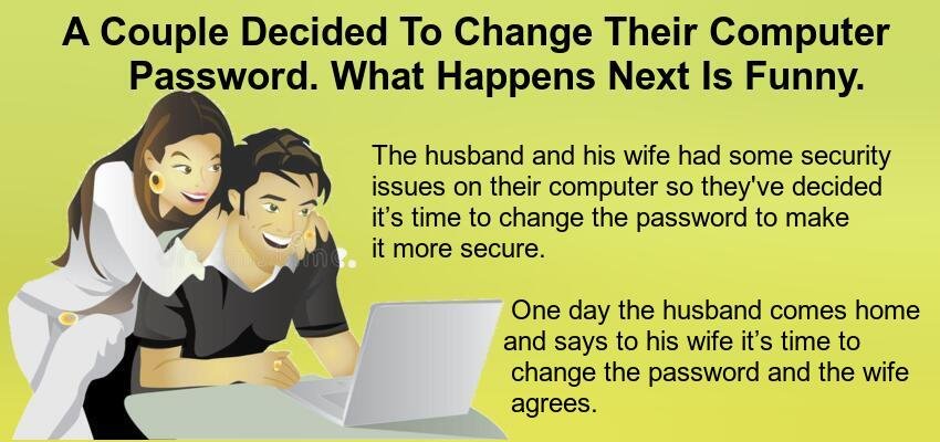 A Couple Decided To Change Their Computer Password. – June 7, 2022 by Kevin Adams Facebook Twitter Pinterest LinkedIn The husband and his wife had some security issues on their computer so they’ve decided it’s time to change the password to make it more secure. One day the husband comes home and says to his wife it’s time to change the password and the wife agrees. So, these two were sitting in their living room trying to set up a new password for their computer. Husband demands that he chooses the password, as he is head of the house and puts, “Mypenis” as the computer password. When he hits ENTER key, the screen says, “Error. Not long enough.” The wife falls on the ground laughing hard. Moral of the story: Men, always read fine print! Facebook Twitter Pinterest LinkedIn