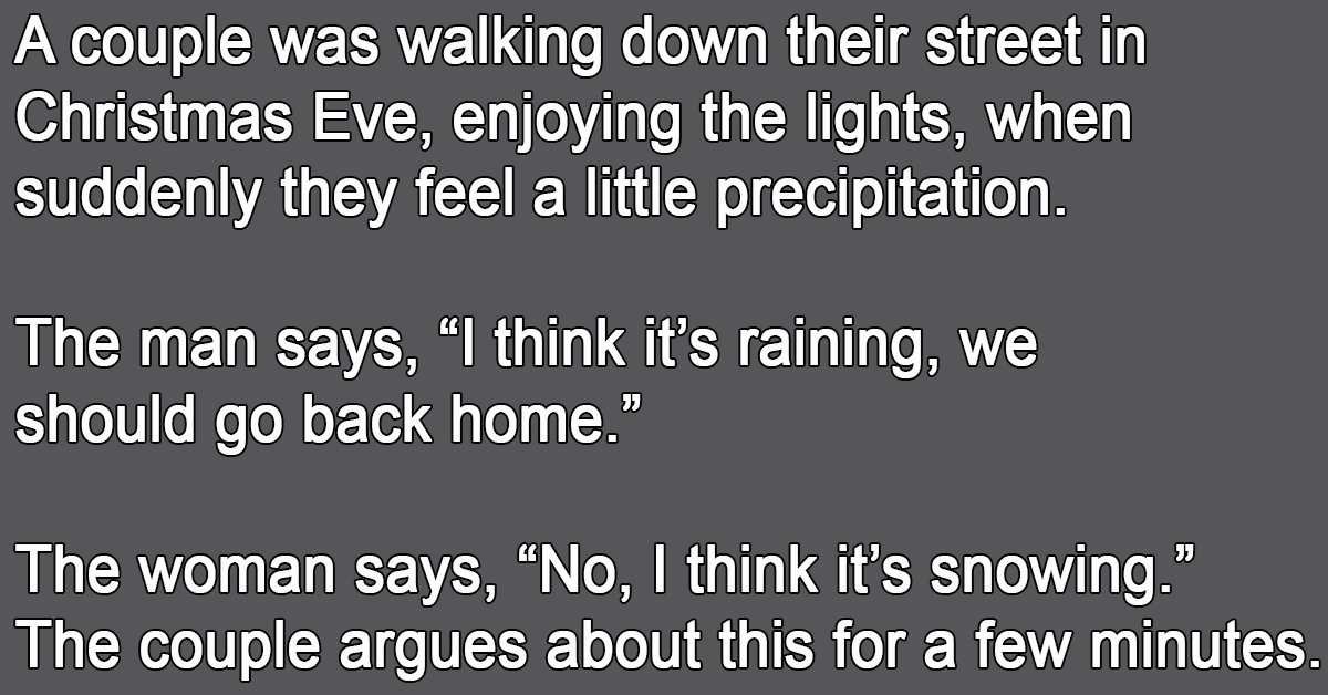 A couple was walking down their street in Christmas Eve, enjoying the lights, when suddenly they feel a little precipitation.