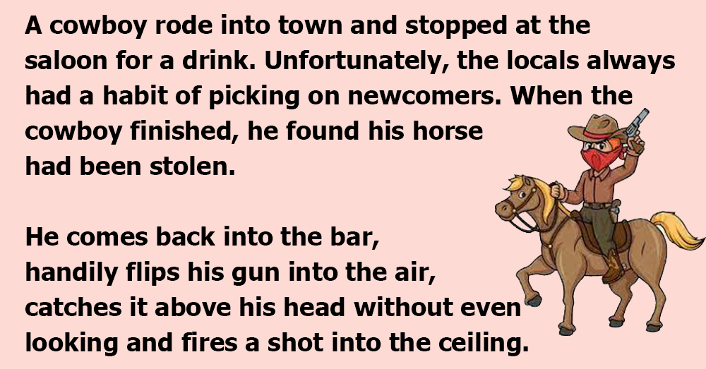 A cowboy rode into town and stopped at the saloon for a drink. Unfortunately, the locals always had a habit of picking on newcomers. When the cowboy finished, he found his horse had been stolen.