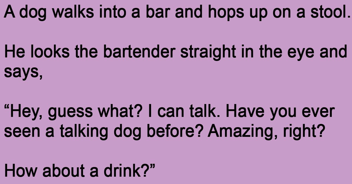“Hey, guess what? I can talk. Have you ever seen a talking dog before? Amazing, right? How about a drink?”