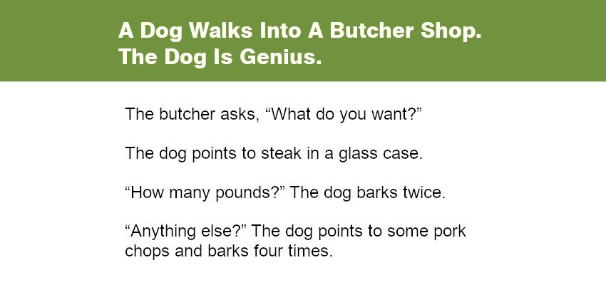 So the butcher wraps up a two-pound steak and four pork chops and places the bag in the dog’s mouth.