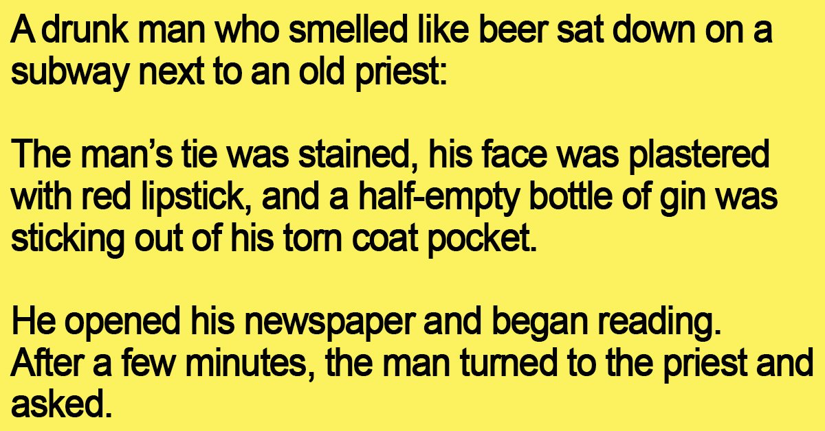 A drunk man who smelled like beer sat down on a subway next to an old priest: