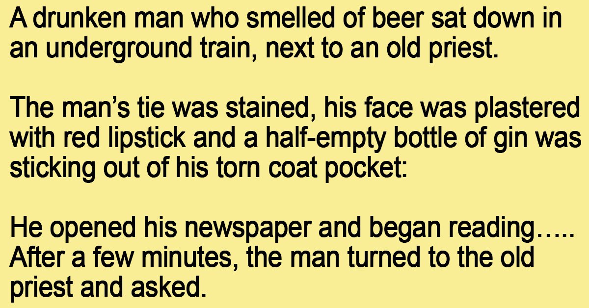 A drunken man who smelled of beer sat down in an underground train, next to an old priest.