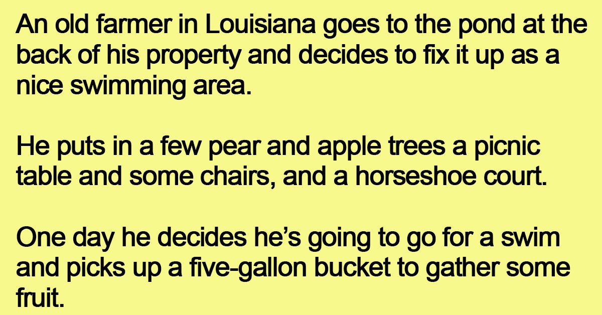An old farmer in Louisiana goes to the pond at the back of his property and decides to fix it up as a nice swimming area.