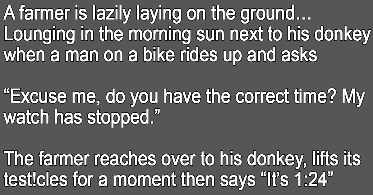 The farmer reaches over to his donkey, lifts its test!cles for a moment then says