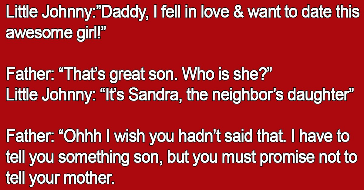 Little Johnny:”Mum I am so mad at dad! I fell in love with six girls but I can’t date any of them because dad is their father!”