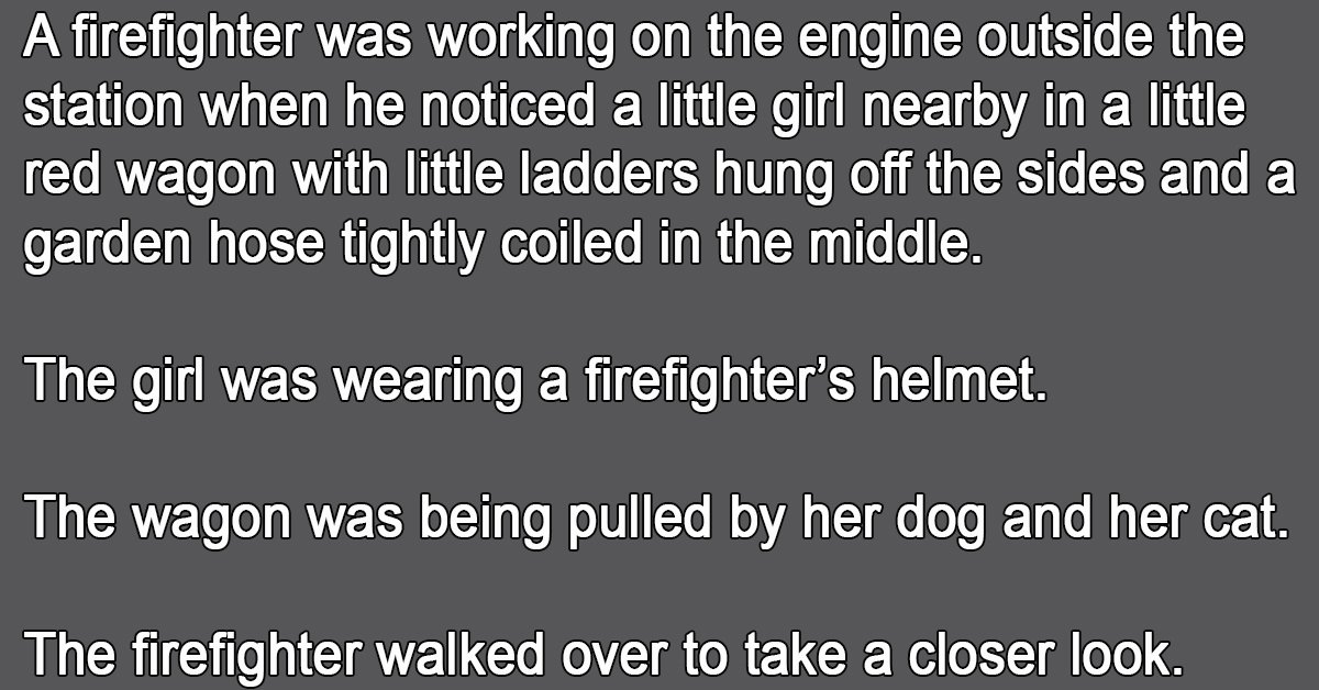 A firefighter was working on the engine outside the station when he noticed a little girl nearby in a little red wagon with little ladders hung off the sides and a garden hose tightly coiled in the middle.