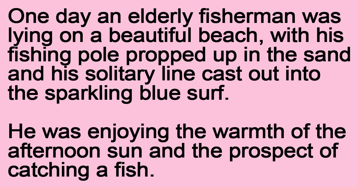 One day an elderly fisherman was lying on a beautiful beach, with his fishing pole propped up in the sand and his solitary line cast out into the sparkling blue surf.