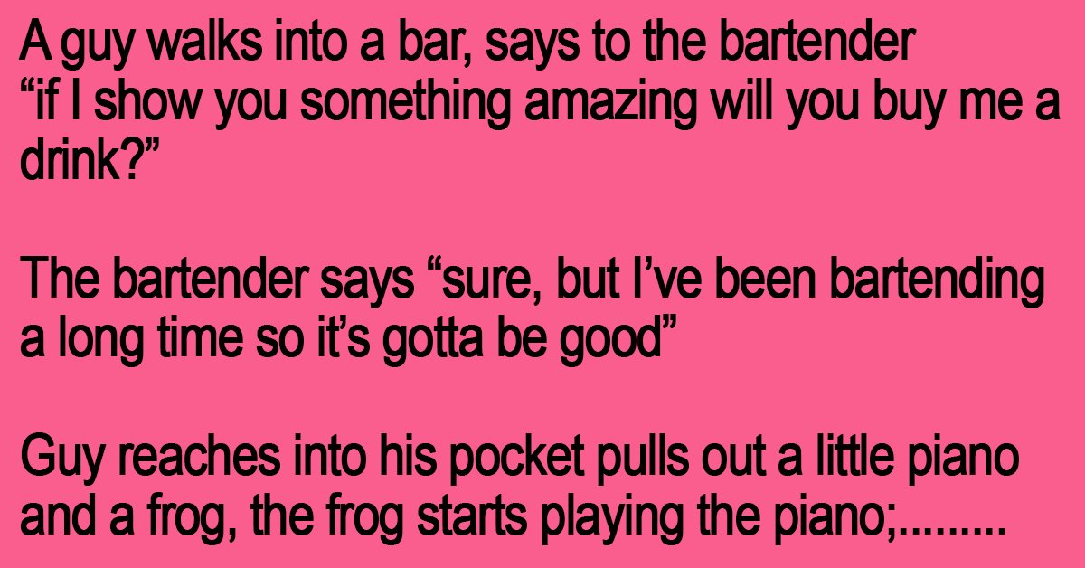 Guy reaches into his pocket pulls out a little piano and a frog, the frog starts playing the piano; the bartender gives the guy his drink.