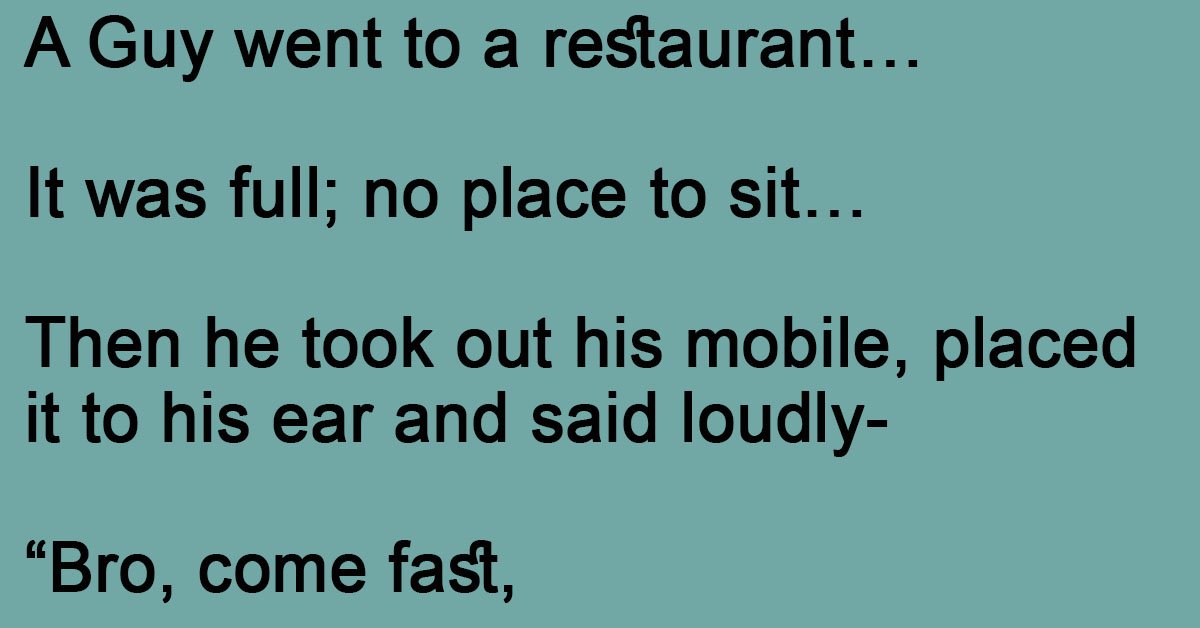 A Guy Went To A Restaurant. July 12, 2023 by Kevin Adams Facebook Twitter Pinterest LinkedInA Guy went to a restaurant… It was full; no place to sit… Then he took out his mobile, placed it to his ear and said loudly- “Bro, come fast, she’s here with someone else”. Six couples ran away… Facebook Twitter Pinterest LinkedIn