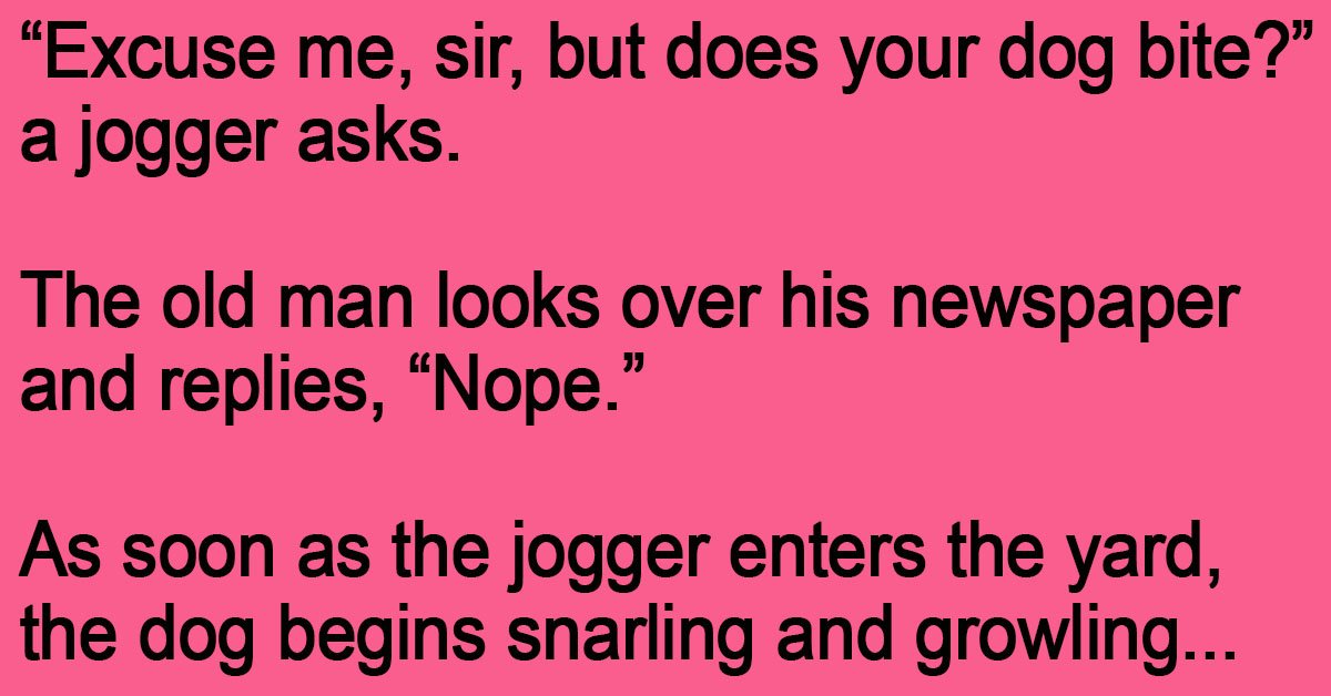 “Excuse me, sir, but does your dog bite?” a jogger asks.