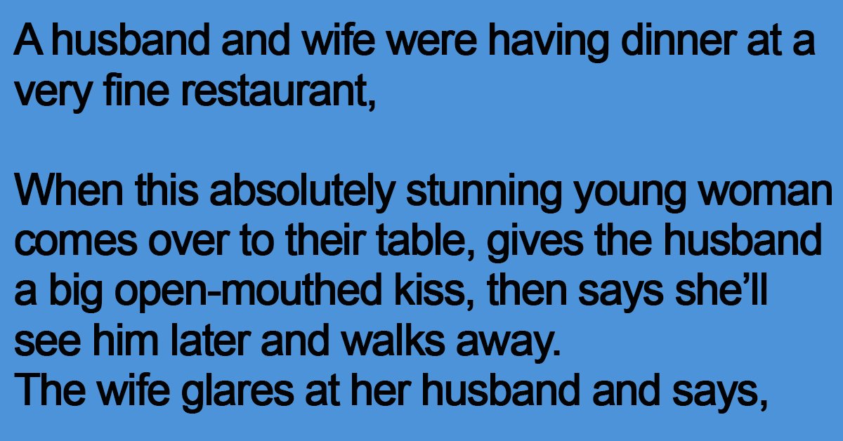 When this absolutely stunning young woman comes over to their table, gives the husband a big open-mouthed kiss, then says she’ll see him later and walks away.