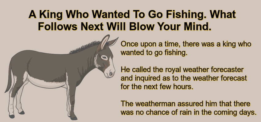 The farmer said, “Your Majesty, I do not know anything about forecasting. I obtain my information from my donkey. If I see my donkey’s ears drooping, it means with certainty that it will rain.”