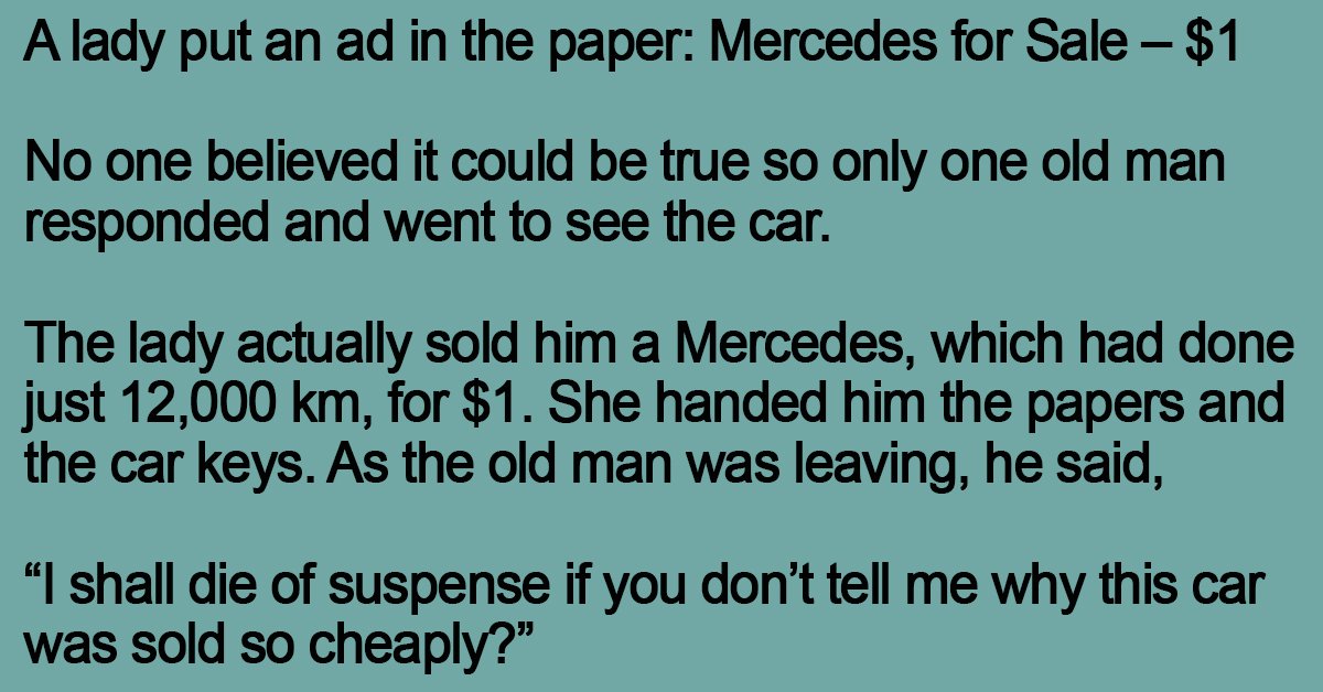 A lady put an ad in the paper: Mercedes for Sale – $1