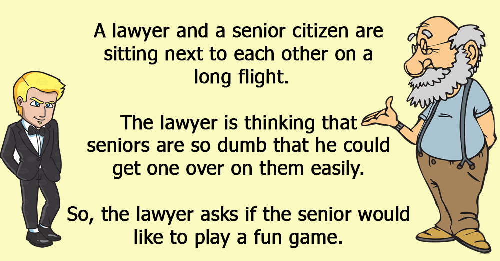 A lawyer and a senior citizen are sitting next to each other on a long flight.