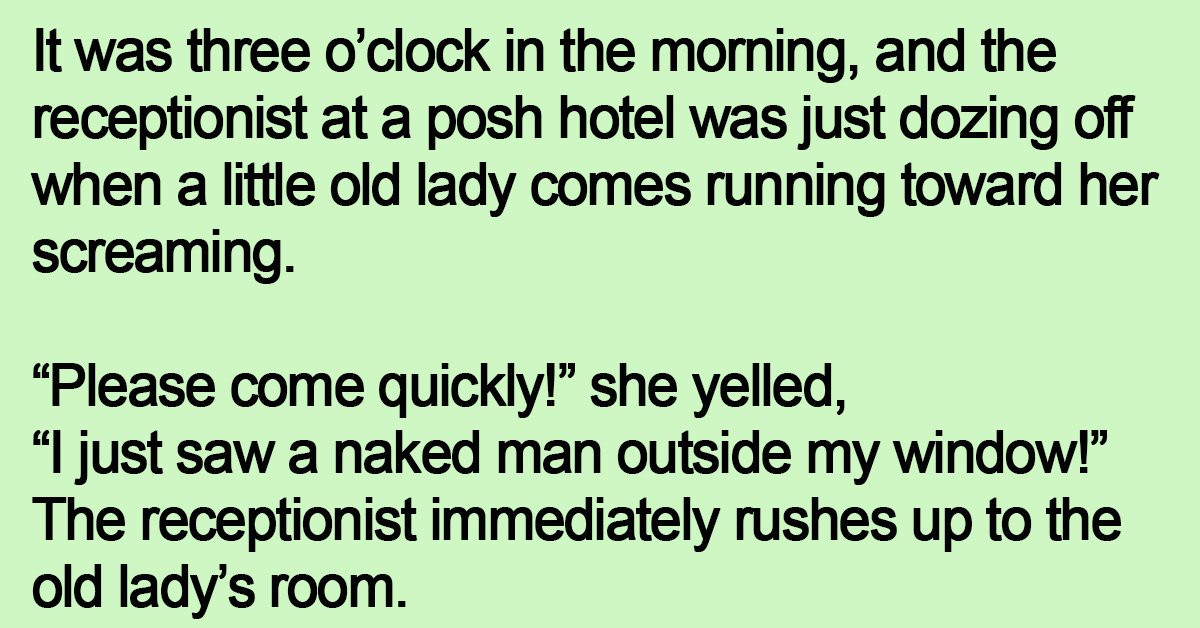 It was three o’clock in the morning, and the receptionist at a posh hotel was just dozing off when a little old lady comes running toward her screaming.