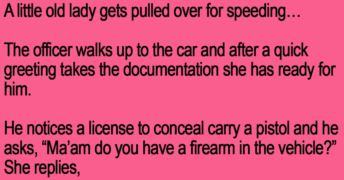 The officer smiles a little as this lady was no more than 5’ tall and 90 lbs. and had to be 90 years old.