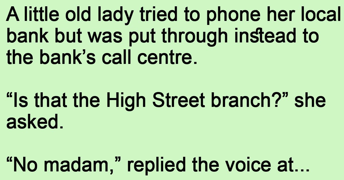 A little old lady tried to phone her local bank but was put through instead to the bank’s call centre.