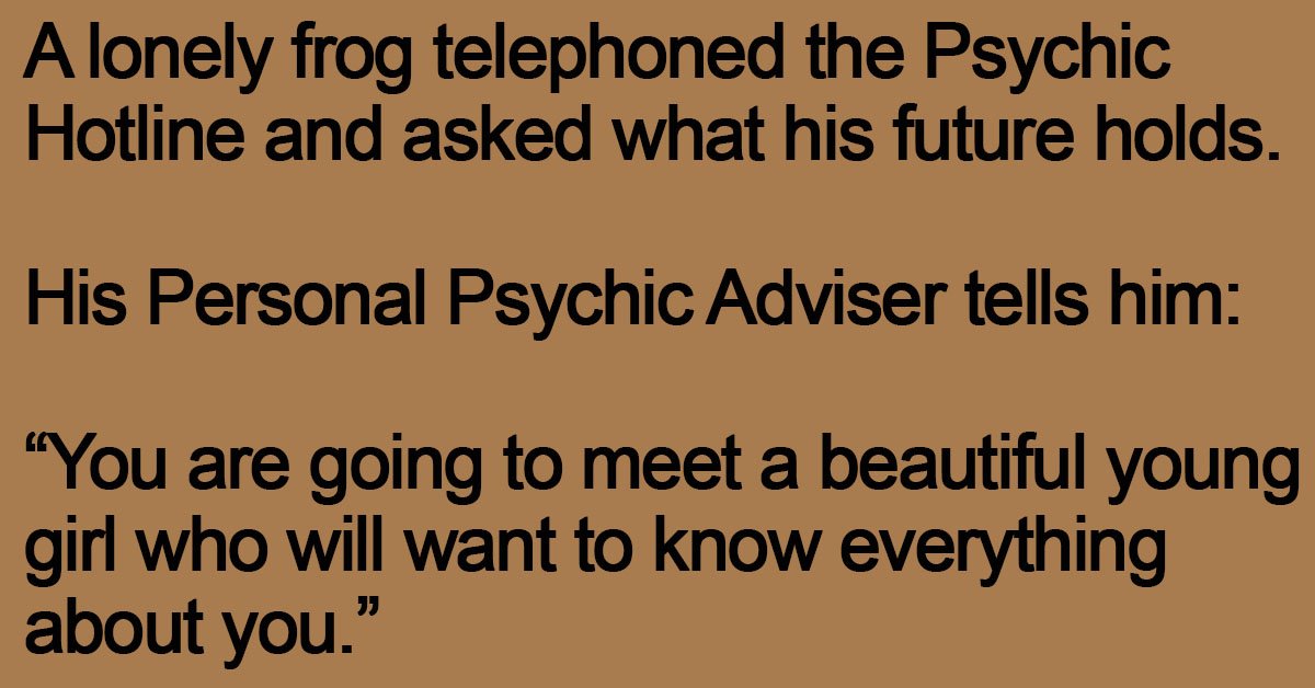 A lonely frog telephoned the Psychic Hotline and asked what his future holds.