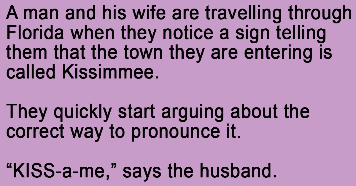 A man and his wife are travelling through Florida when they notice a sign telling them that the town they are entering is called Kissimmee.