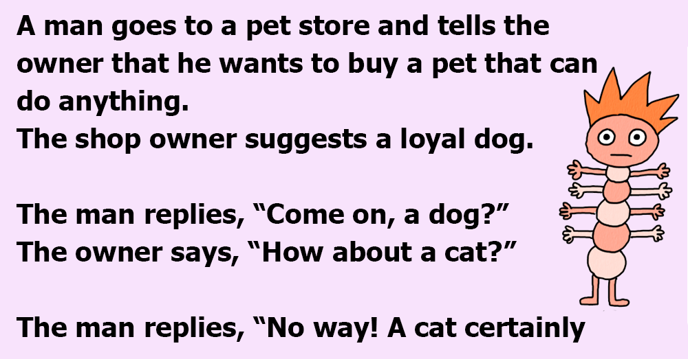 The man replies, “No way! A cat certainly cannot do everything. I want a pet that can do everything!”