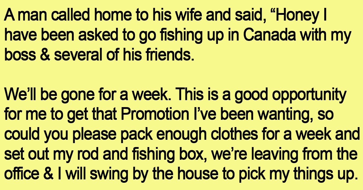 “Honey I have been asked to go fishing up in Canada with my boss & several of his friends. We’ll be gone for a week. This is a good opportunity for me to get that Promotion I’ve been wanting, so could you please pack enough clothes for a week and set out my rod and fishing box, we’re leaving from the office & I will swing by the house to pick my things up. And please pack my new blue silk pyjamas.”
