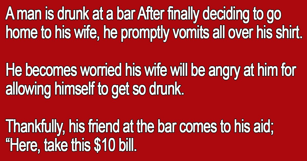 “Here, take this $10 bill. Tell your wife some guy threw up on your shirt, and he gave you this $10 to replace it.”