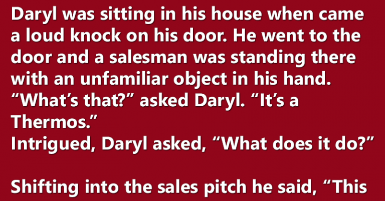 Daryl was sitting in his house when came a loud knock on his door. He went to the door and a salesman was standing there with an unfamiliar object in his hand. “What’s that?” asked Daryl. “It’s a Thermos.”
