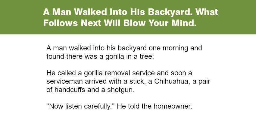 He called a gorilla removal service and soon a serviceman arrived with a stick, a Chihuahua, a pair of handcuffs and a shotgun.