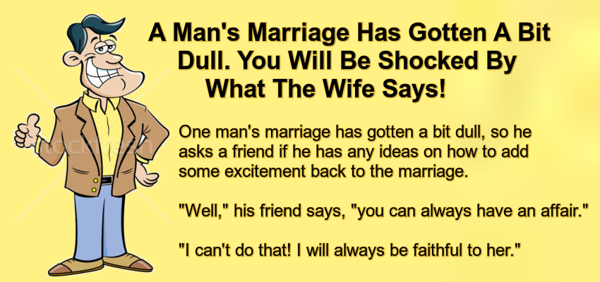 One man’s marriage has gotten a bit dull, so he asks a friend if he has any ideas on how to add some excitement back to the marriage.