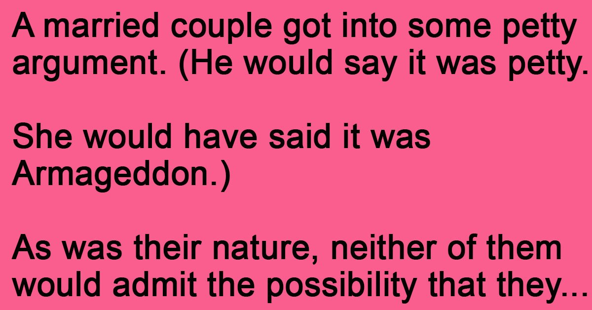 A married couple got into some petty argument. (He would say it was petty. She would have said it was Armageddon.)