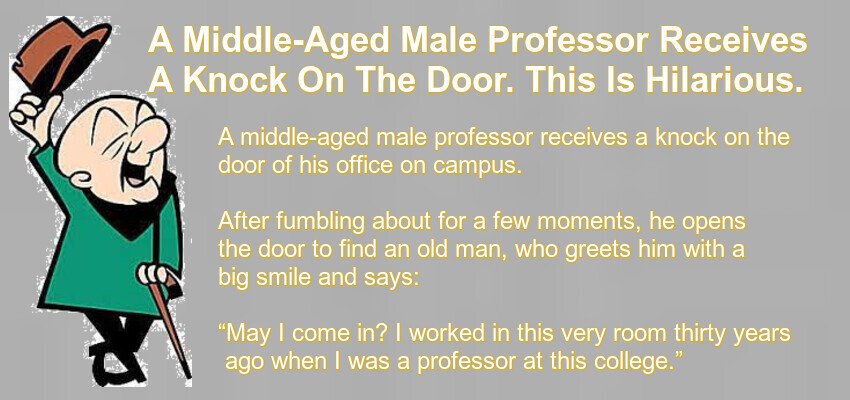 A Middle-Aged Male Professor Receives A Knock On The Door. – May 16, 2022 by Kevin Adams Facebook Twitter Pinterest LinkedIn A middle-aged male professor receives a knock on the door of his office on campus. After fumbling about for a few moments, he opens the door to find an old man, who greets him with a big smile and says: “May I come in? I worked in this very room thirty years ago when I was a professor at this college.” “Sure!” replied the professor. “Be my guest!” The old man examined the room, fondly remembering everything. He said, “The same old room, the same old wooden table, the ventilator and the same old window that opens to the garden. And the same old desk.” When examining it, he noticed there was a young girl hiding under the desk. The young man got alarmed and stammered, “Don’t mistake me. She’s my daughter. She dropped her earring and is searching for it.” “And the same old story…” Sighed the old man. Facebook Twitter Pinterest LinkedIn