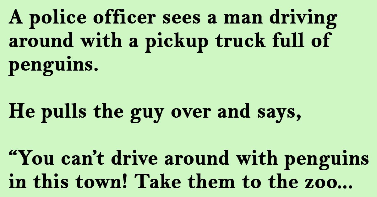 A police officer sees a man driving around with a pickup truck full of penguins.