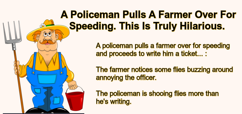 A Policeman Pulls A Farmer Over For Speeding. – May 18, 2022 by Kevin Adams Facebook Twitter Pinterest LinkedIn A policeman pulls a farmer over for speeding and proceeds to write him a ticket… : The farmer notices some flies buzzing around annoying the officer. The policeman is shooing flies more than he’s writing. The farmer says “I see you’re being bothered by those circle flies.” The policeman says, “If that’s what you call them, yes, they are somewhat annoying. The farmer says, “Yeah, we call them that because we see them circling around the rear ends of horses.” The policeman says, “Hmmm. Did you just call me a horse’s a$s?” The farmer says, “Oh, no sir, officer. I have way too much respect for those who serve in law enforcement to ever say such a thing.” The policeman says, “Well, that’s a good thing, then.” The farmer adds, “But it sure is hard to fool those circle flies.” Facebook Twitter Pinterest LinkedIn