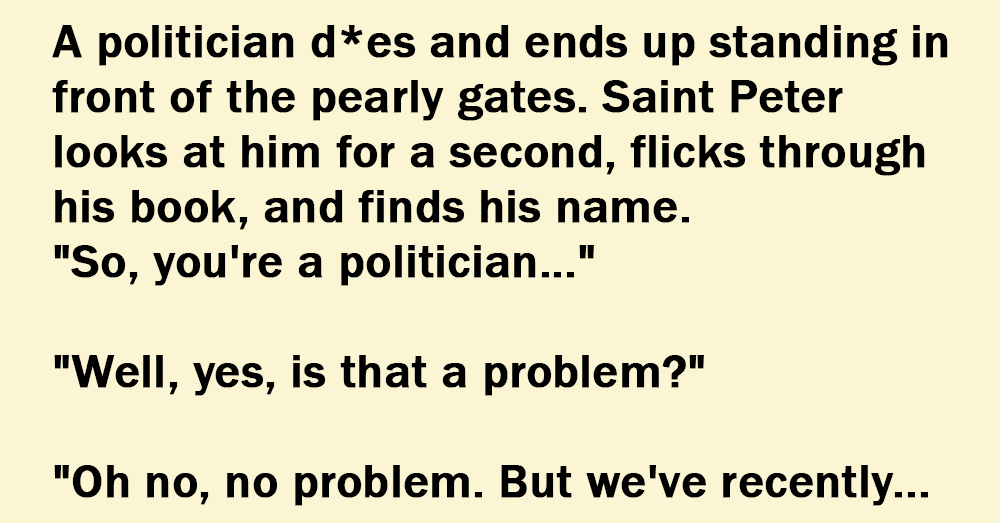 “Well… I know this sounds strange, but on balance, I think I’d prefer Hell,” says the politician. “Not a problem, we totally understand! Enjoy!” says St Peter, and clicks his fingers again.