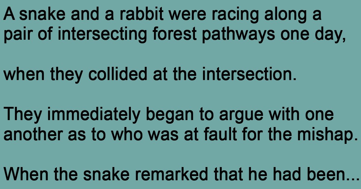 A snake and a rabbit were racing along a pair of intersecting forest pathways one day,