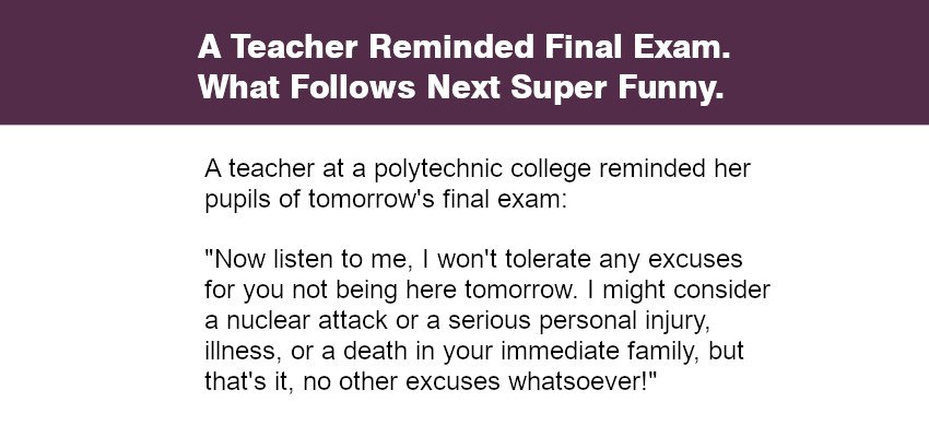 “Now listen to me, I won’t tolerate any excuses for you not being here tomorrow. I might consider a nuclear attack or a serious personal injury, illness, or a death in your immediate family, but that’s it, no other excuses whatsoever!”