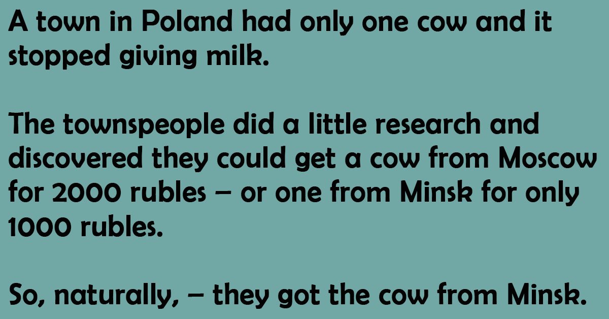 The townspeople did a little research and discovered they could get a cow from Moscow for 2000 rubles – or one from Minsk for only 1000 rubles.