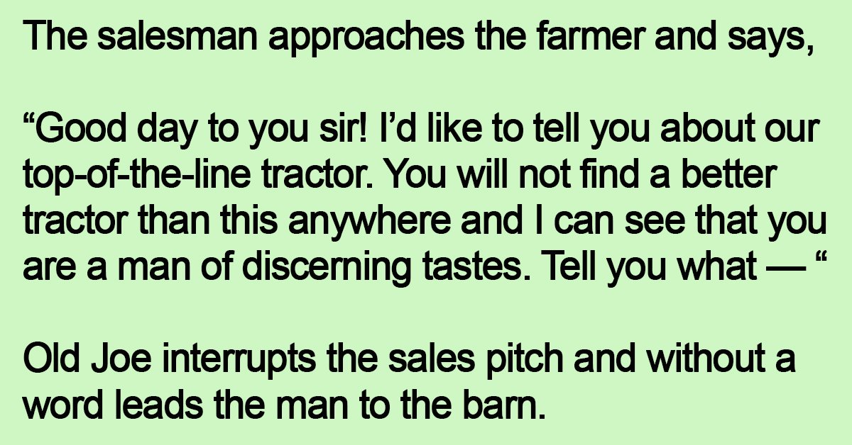 The salesman gives a puzzled nod, and the farmer continues.