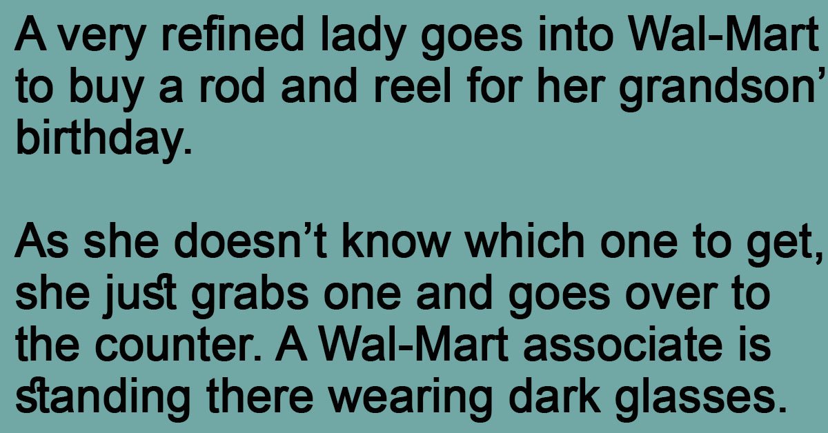 A very refined lady goes into Wal-Mart to buy a rod and reel for her grandson’s birthday.