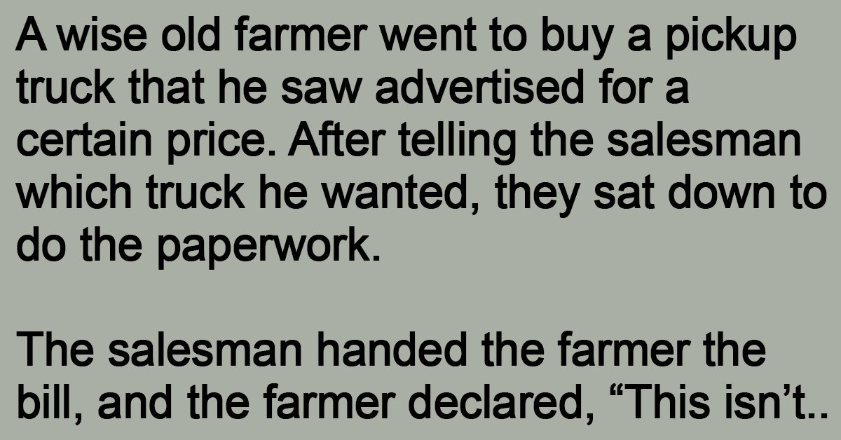 A wise old farmer went to buy a pickup truck that he saw advertised for a certain price. After telling the salesman which truck he wanted, they sat down to do the paperwork.