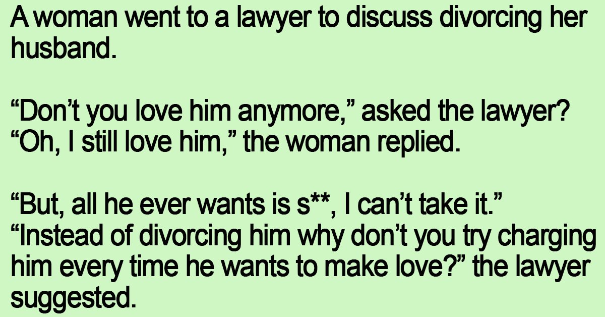 “Instead of divorcing him why don’t you try charging him every time he wants to make love?” the lawyer suggested.