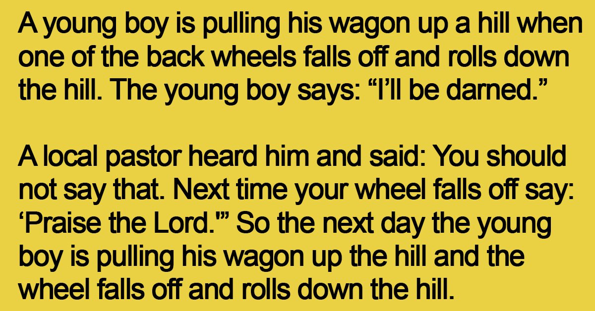 So the next day the young boy is pulling his wagon up the hill and the wheel falls off and rolls down the hill.