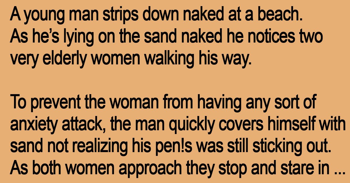 As he’s lying on the sand naked he notices two very elderly women walking his way.