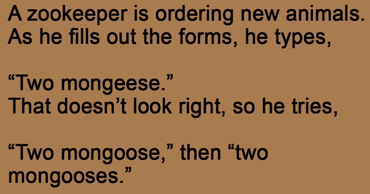 “Two mongoose,” then “two mongooses.”