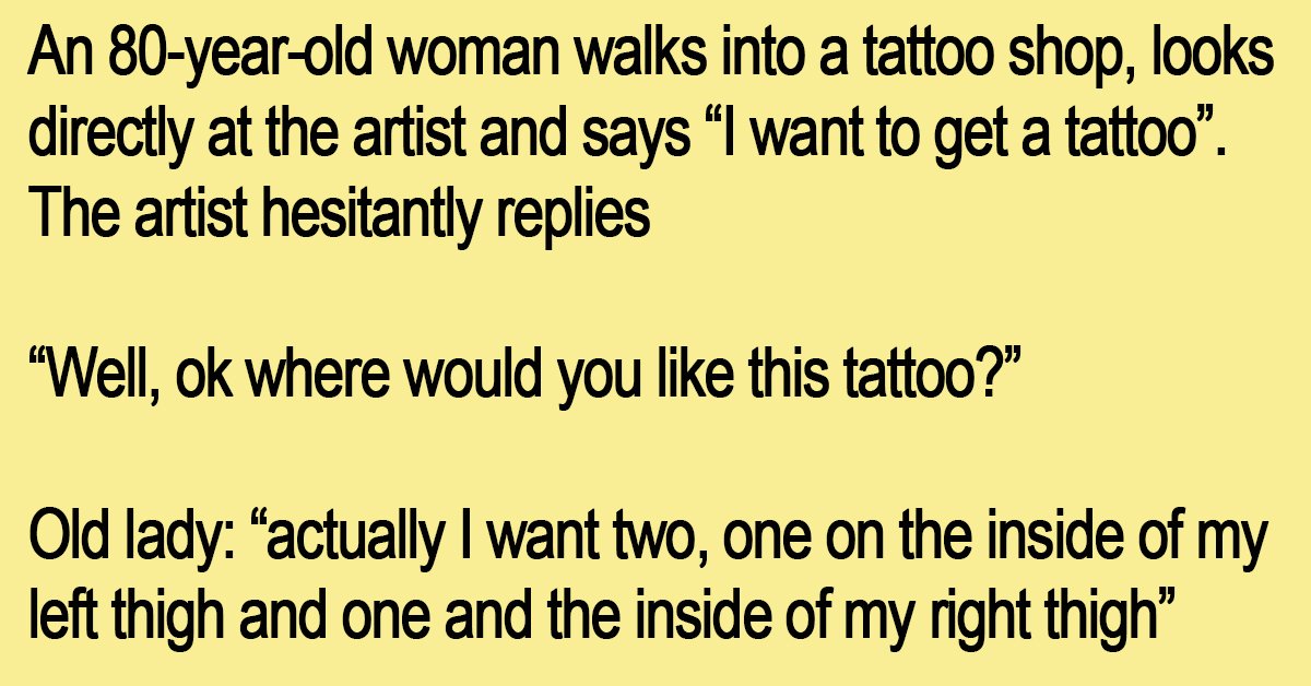 An 80-year-old woman walks into a tattoo shop, looks directly at the artist and says